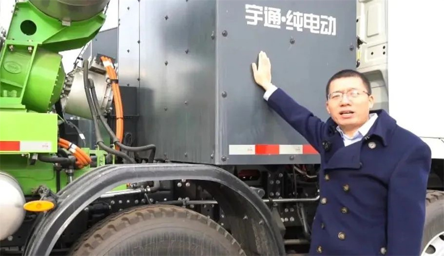 在搶答互動環(huán)節(jié)后,中集凌宇攪拌車技術部產(chǎn)品項目經(jīng)理許國偉及宇通攪拌車產(chǎn)品管理工程師李飛以“云端直播”的形式為觀眾帶來解放、陜汽及宇通三款新能源攪拌車實車現(xiàn)場的360度講解。